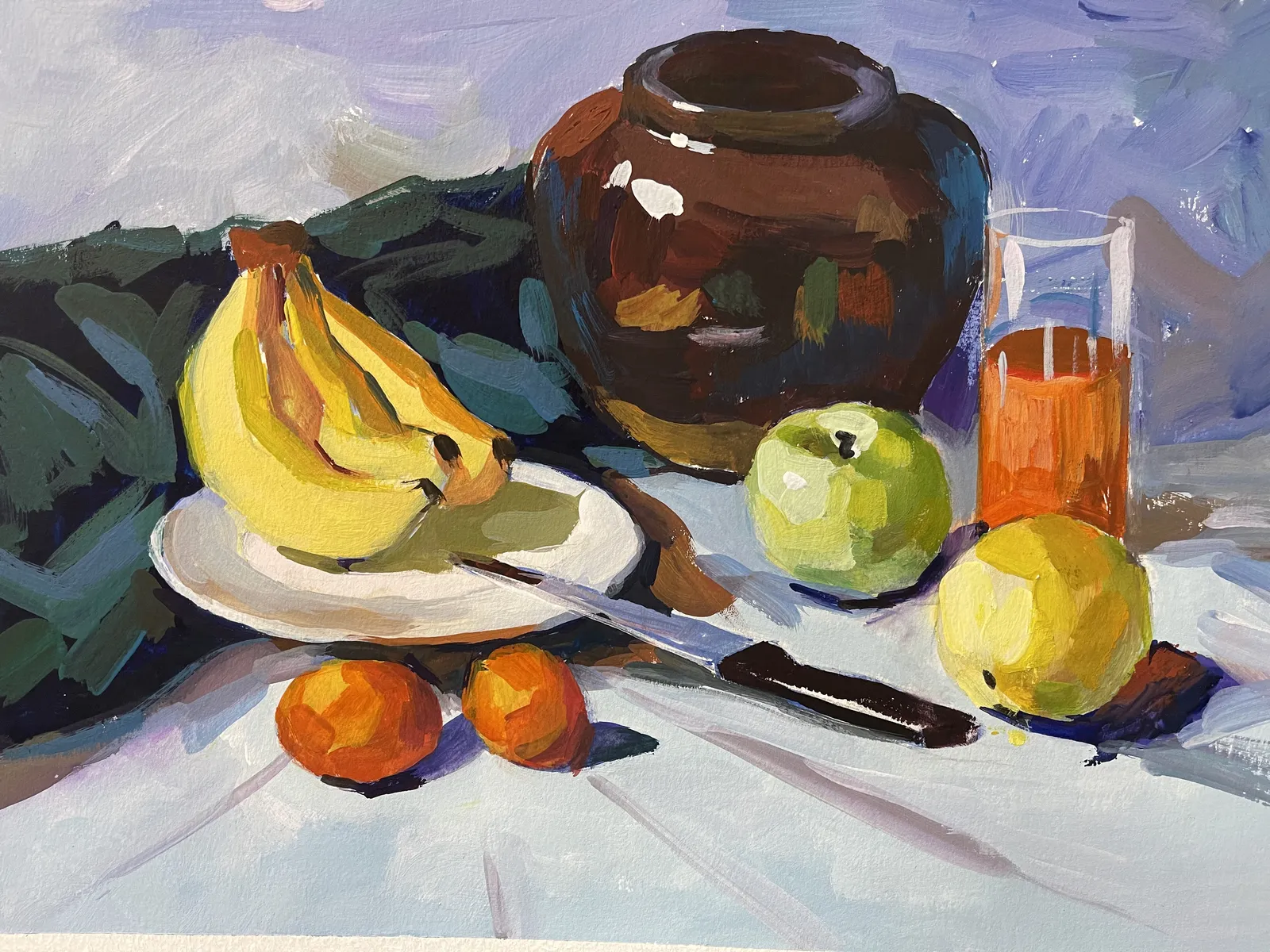An opaque water-based medium ideal for vivid, matte illustrations. Students explore flat washes, layering, and color theory to produce striking compositions.